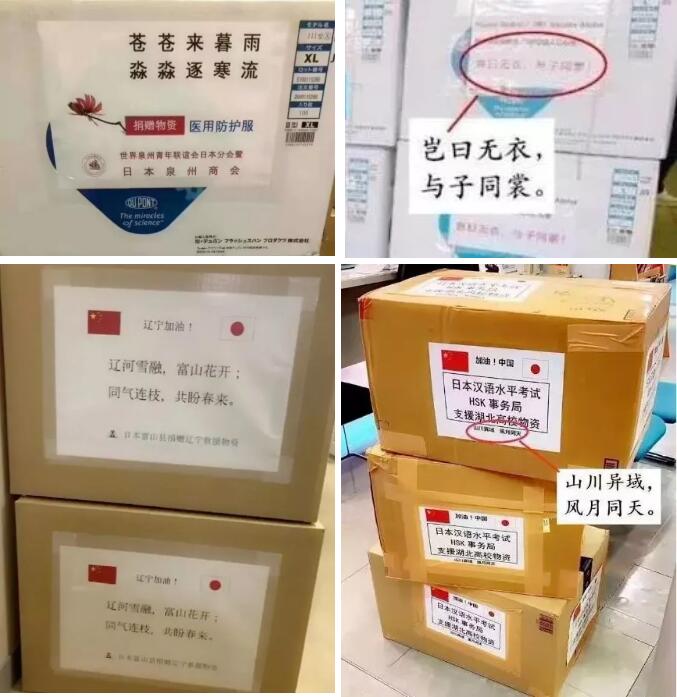 日本政府在疫情開始的第一時(shí)刻,就保證會(huì)幫助中國渡過難關(guān)。日本株式會(huì)社捐贈(zèng)了3300套防護(hù)服、6000雙鞋套、賦詞豈日無衣,與子同裳。富山縣向友好省縣遼寧省捐贈(zèng)了一萬枚口罩,上面寫著:遼河雪融,富士花;同氣連枝,共盼春來。HSK事務(wù)所捐贈(zèng)了兩萬枚口罩,上面寫著:山川異域,風(fēng)月同天。